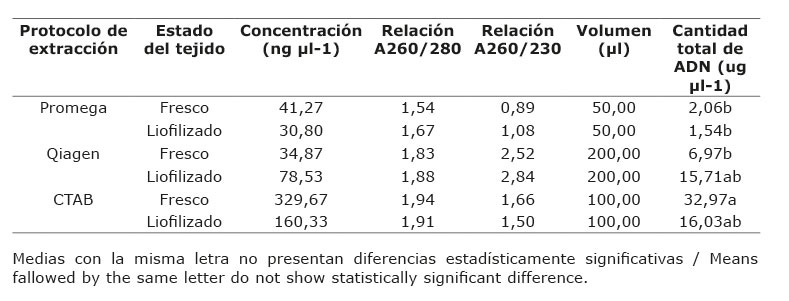 Con el método de extracción CTAB y el empleo de tejido fresco, se logró aislar en números absolutos la mayor cantidad de ADN genómico (Figura 2, muestras 7, 8 y 9), aunque no difirió estadísticamente del tratamiento CTAB y Qiagen que usaron tejido liofilizados. Donde sí se presentaron diferencias significativas fue con respecto a los métodos de extracción Qiagen con tejido fresco y Promega con ambos tipos de tejido (Cuadro 1). A su vez cuando el tejido fue liofilizado no se presentaron diferencias estadísticas significativas entre los tratamientos (p≥0,007).