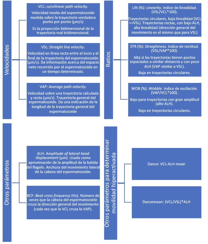 Después de analizar las imágenes, el programa estima el porcentaje de espermatozoides móviles totales, móviles progresivos, porcentaje de espermatozoides estáticos, lentos, medios o rápidos, de acuerdo con los criterios de la Organización Mundial de la Salud (OMS) (Word Health Organization, 2016). Además, el programa también proporciona una serie de datos de velocidad, ratios, parámetros que aportan información respecto de la amplitud o de la frecuencia de batida del flagelo, que pueden ser indicadores de la movilidad hiperactivada (Mortimer et al., 2015). En la Figura 1 se presentan las principales variables de cinética espermática.