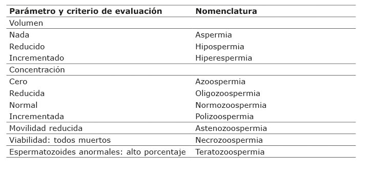 Dentro del espermiograma clásico se incluyen pruebas macroscópicas y microscópicas sencillas que pueden realizarse sin necesidad de equipos de laboratorio muy sofisticados. En el Cuadro 1 se muestra la nomenclatura que se utiliza en los análisis de semen en función de la calidad que presentan los eyaculados para parámetros andrológicos (Ax et al., 2016).