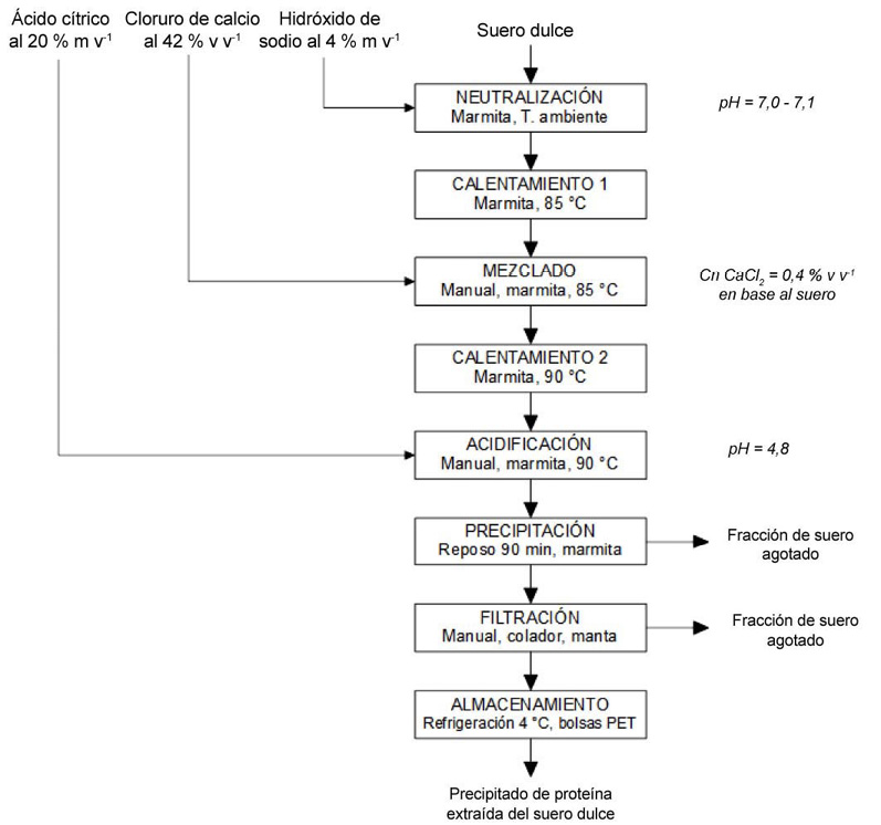 Para la extracción de la proteína se realizó un proceso de acidificación y precipitación a partir del suero dulce que se describe en la Figura 2.