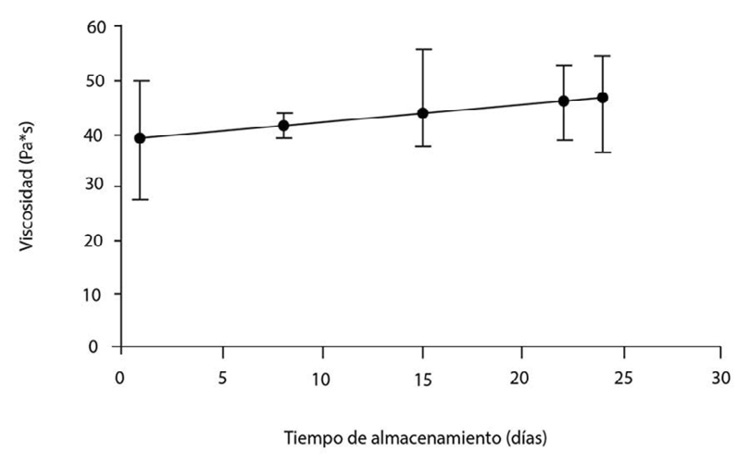 Figure 3. Behavior of the apparent viscosity of yogurt with added protein, during storage time. Data reported as means ± the confidence interval (n=4), with 95 % as a level of confidence. Centro Nacional de Ciencia y Tecnologia de Alimentos (CITA), Universidad de Costa Rica, San Jose, Costa Rica. 2013.