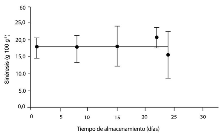 En el tiempo 0 del estudio de almacenamiento, se evidencia que la sinéresis no disminuyó en el yogur con proteína añadida, como lo reportaron otros autores (Bertrand et al., 2008; Hugunin, 2009), si bien los ingredientes del suero lácteo tienen un efecto de reducción de este tipo de defectos, la forma de obtención de esta influye en su funcionalidad. En el presente estudio se utilizó una temperatura de 90 °C para la recuperación de la proteína, Sodini et al. (2006) reportaron que, a temperaturas de obtención de 88 °C, la funcionalidad de la proteína sérica se vio afectada y disminuyó su capacidad de retención de agua. Mientras que en el estudio de almacenamiento se esperaba ver un aumento de la sinéresis en el tiempo (Zare et al., 2011), debido a la disminución de la capacidad de retención de agua de las proteínas, en el presente estudio se mantuvo constante durante los 24 días de almacenamiento.