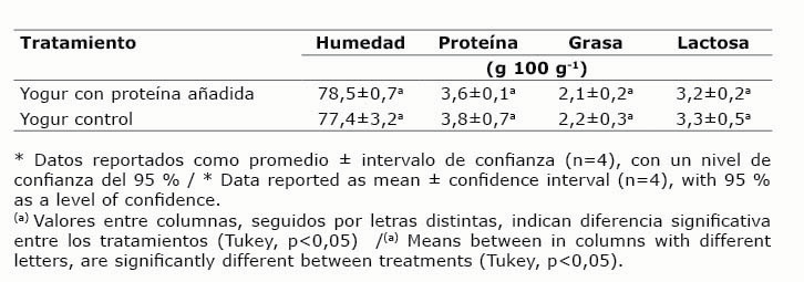 El yogur con proteína añadida y el yogur control no presentaron diferencias significativas (p<0,05) en cuanto a su composición química (Cuadro 1), lo que demuestra que el ajuste en la formulación del yogur con proteína añadida permitió mantener la concentración de este nutriente constante en ambas muestras.