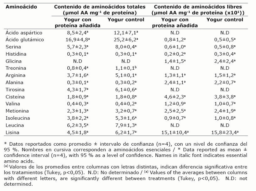 Table 2. Total amino acid content (μmol AA mg-1 of protein) and free amino acid content [(μmol AA mg-1 of protein (x101)] on yogurt with added protein and yogurt control. Centro Nacional de Ciencia y Tecnologia de Alimentos (CITA) y Centro de Investigacion en Nutricion Animal (CINA), de la Universidad de Costa Rica, San Jose, Costa Rica. 2013.