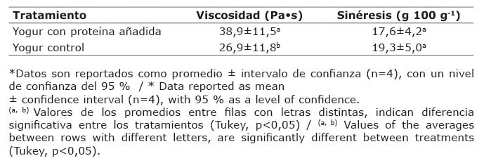 El yogur con proteína añadida presentó una viscosidad significativamente mayor (p<0,05) a la del yogur control, pero no se encontraron diferencias significativas (p<0,05) en la sinéresis de los productos elaborados (Cuadro 3).