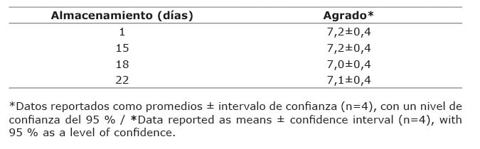 Durante el tiempo de almacenamiento no se vio afectada la estabilidad ni la calidad del yogur con proteína añadida, lo que permitió establecer como parámetro al menos veintidós días de vida útil para este producto, pudiéndose extender si se adicionara un preservante a su formulación. Esto debido a que los panelistas percibieron los yogures de forma similar, sin importar el tiempo de almacenamiento (Cuadro 4).