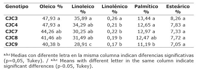 La participación de ácidos grasos en el aceite de los genotipos de JC fue mayor en los monoinsaturados (oleico) y poliinsaturados (linoleico). Los valores de ácido oleico variaron entre 47,93 % (CJC3) y 40,38 % (CJC9); mientras que los del ácido linoleico estuvieron entre 35,89 % (CJC3) y 28,91 % (CJC9), en ambos casos diferentes estadísticamente (α<0,05). En menor proporción se obtuvieron los ácidos palmítico y esteárico (saturados) y linolénico (poliinsaturado); en el caso del palmítico los valores variaron entre 13,44 % (CJC3) y 11,19 % (CJC9), el esteárico varió entre 8,26 % (CJC3) y 7,05 % (CJC9) y el linolénico estuvo entre 0,26 % (CJC3) y 0,17 % (CJC9), diferente estadísticamente (α<0,05). CJC9 fue el genotipo que presentó los menores valores para todos los ácidos grasos determinados (Cuadro 1).