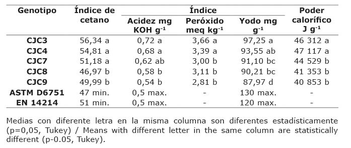 El índice de cetano como índice relativo de la mayor o menor inflamabilidad de un biocombustible para motores de combustión interna (tipo diésel), presentó los valores más altos e iguales estadísticamente entre sí, en los genotipos CJC3 (56,34), CJC4 (54,81) y CJC7 (51,18) y los de menor valor con los genotipos CJC8 (46,97) y CJC9 (49,99), sin diferir estos dos últimos estadísticamente. El valor de acidez presentó valores de 0,72 mgKOH g-1 para el genotipo CJC3 y 0,52 mgKOH g-1 para el genotipo CJC9, diferentes estadísticamente (p=0,05) (Cuadro 2). El índice de peróxido presentó valores que variaron entre 3,66 meq kg-1 (CJC3) a 2,81 meq kg-1 (CJC9), los cuales fueron diferentes estadísticamente (α<0,05; Cuadro 2).