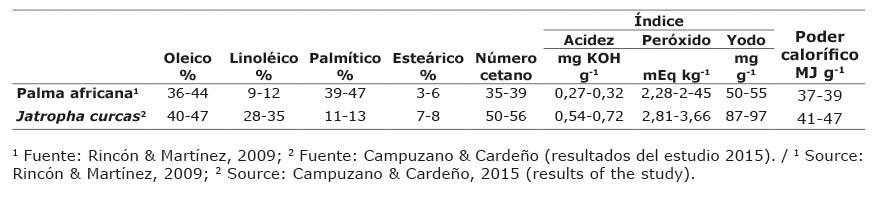 El aceite de los genotipos de JC en este estudio presentó tres veces más de contenido de ácido linoleico, casi el doble del ácido esteárico y tres veces menos de ácido palmítico en comparación con el aceite de palma; esta constitución lipídica del aceite de los genotipos de JC estudiados mostró una superioridad de 1,4 veces más del índice de cetano, dos veces más del valor de acidez y 1,7 veces más en el índice de peróxido y yodo, en comparación con el aceite de palma; el poder calorífico del aceite de JC fue superior al aceite de palma de aceite (Cuadro 3).