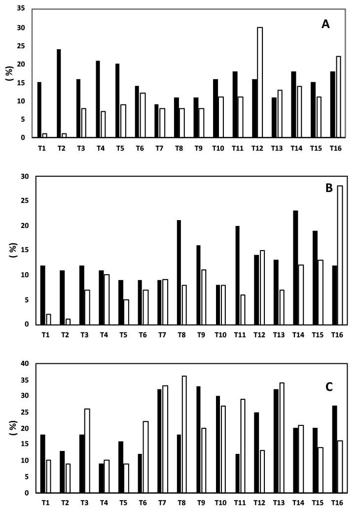 Figure 1. Incidence at the beginning (black bar) and end of the trial (white bar) of Moniliophthora roreri (A), Phytophthora sp. (B) and cherelle wilt (C) in cocoa (Theobroma cacao) cv ‘CCN-51 experiment, in Luz de America, Santo Domingo de los Tsachilas, Ecuador. 2016-2017.