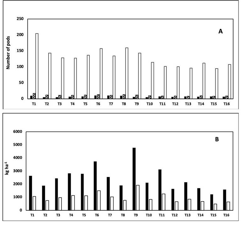 These results demonstrated that, for the control of the pathogens in cacao pods, the cultural labors were important, but when it was complemented with other control methods (biological or chemical), the results were better and allowed to obtein the highest rates of economic return (Jáuregui, 2001). In a similar work carried out in the Ecuadorian town of Puerto Limon, it was found that in a treatment where various components were also combined [Cultural Labor + Chlorothalonil (1 kg ha-1) (every 15 days) + Pyraclostrobin (0.5 kg ha-1) (every 90 days) + Fertilizer (0.4 kg plant-1) + Fertilizer (2 kg plant-1)], the results showed that it was the one that allowed the highest net income per ha (Anzules et al., 2019). In other study carried out in Manabi (Ecuador), the percentage of healthy pods increased due to the use of chemical fungicides (Arroyave, 2007), but the number of pods and the yield were not directly related and the highest yield of dry cocoa corresponded to T9, a biological control treatment.