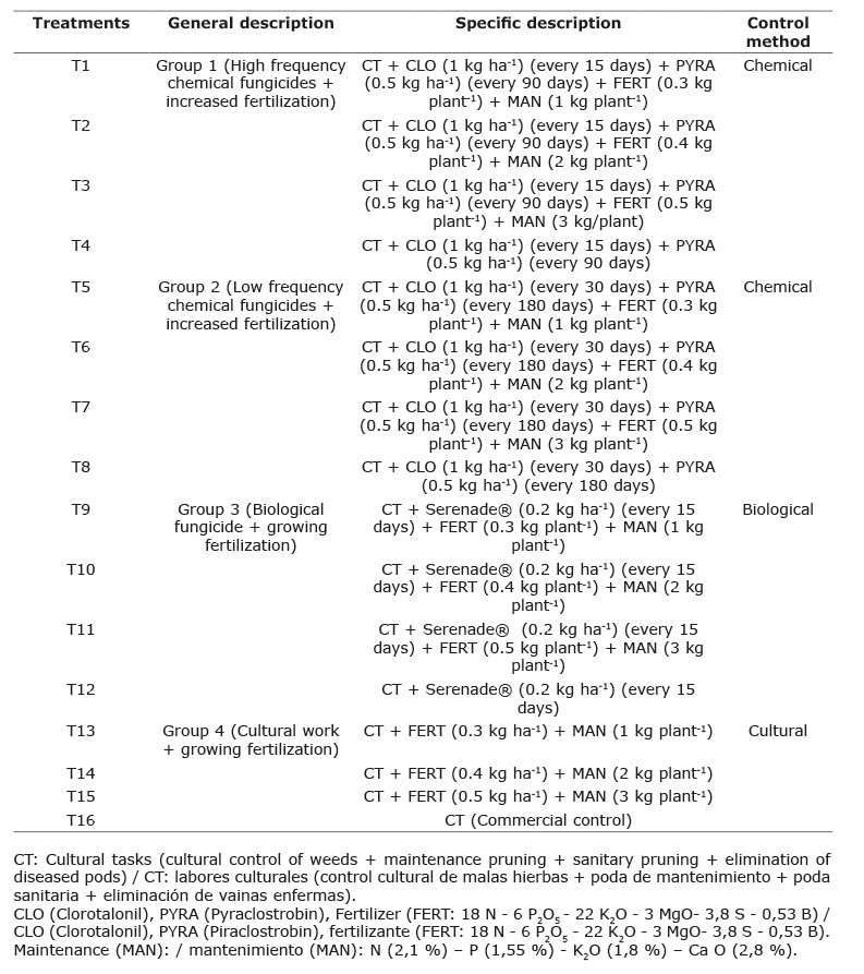 Few studies have been carried out to evaluate the integration of several control measures in a unified program referred to as integrated system of disease management (Acebo et al., 2012). Significant reduction in the incidence of the moniliasis were reported with the use of an integrated management program (Ortíz et al., 2015; Maldonado, 2015).