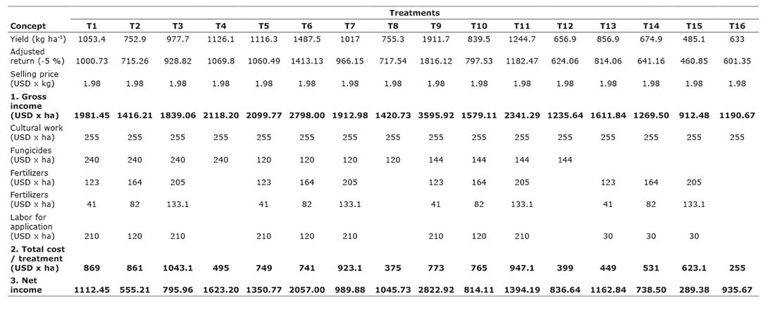 Cuadro 2. Análisis económico de los tratamientos estudiados para el control de enfermedades de la mazorca de cacao (Theobroma cacao) cv ‘CCN-51‘, en Luz de América, Santo Domingo de los Tsáchilas, Ecuador. 2016-2017.