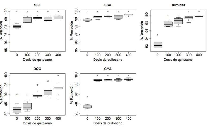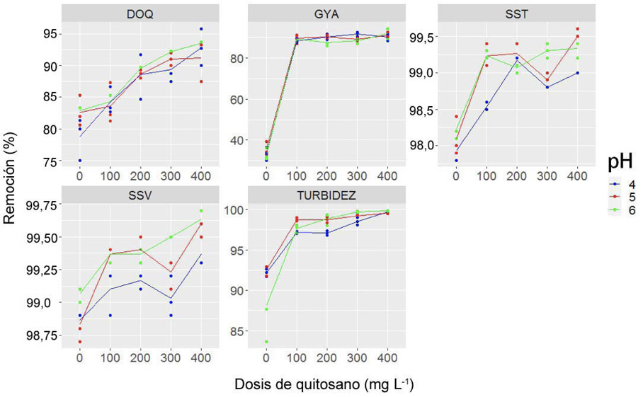 Aunque el tratamiento control (0 mg L-1) removió un 98,1 % para SST y 98,9 % para SSV, para GYA solo removió un 33,9 %, debido a que si no se aplica coagulante, se dificulta la reducción de partículas de inferior tamaño a los sólidos en suspensión (Pérez, 2005); por ello, biopolímeros como el quitosano coagulan y floculan las partículas a través de la neutralización de carga (López-Maldonado et al., 2014). Por lo tanto, el quitosano se adhiere a superficies aniónicas de menor tamaño presentes en el agua (Ahmad et al., 2006).