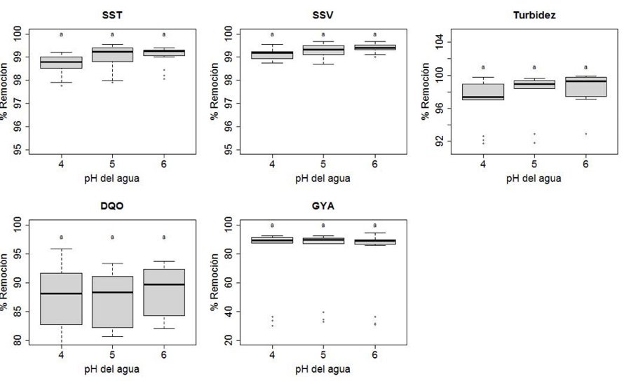 Según el valor inicial registrado para las variables DQO, turbidez, SST, SSV y grasas y aceites (Cuadro 1), se logró reducir hasta el 92,5 %, 99,7 %, 99,3 %, 99,5 % y 91 %, respectivamente para la dosis de 400 mg L-1 (Figura 1). Del mismo modo, al llevar a cabo el análisis de varianza y la comparación de medias, el factor pH no presentó efecto significativo (p>0,05) en la evaluación de las variables de estudio (Figura 2).