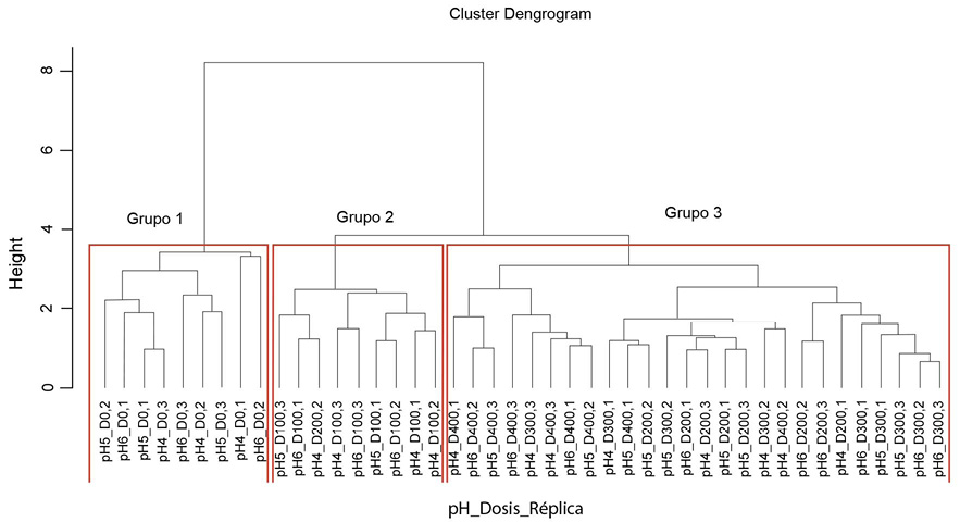 Las agrupaciones encontradas muestran el comportamiento para cada parámetro físico-químico ante las distintas dosis de quitosano, lo que facilita la visualización contrastante de las diferencias entre aplicar una dosis u otra.