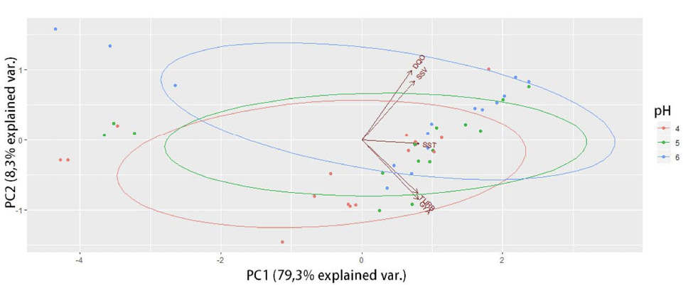 El biplot de forma, con base en el pH del agua, se observa en la Figura 5, donde se puede visualizar que el intervalo de pH del agua utilizado en esta investigación no influyó en la eficiencia del quitosano para la remoción de parámetros fisicoquímicos. Sin embargo, se ha reportado que la remoción con quitosano puede favorecerse por un valor de pH ácido cercano a 4,5, mientras que valores de pH superiores reducen la eficiencia del quitosano.