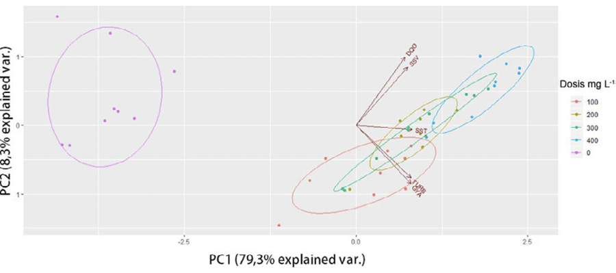 La distribución de los efectos generados con el tratamiento de quitosano, se observó en un biplot, conformado por los componentes principales PC1 y PC2 (Figura 6), que permitieron explicar el 79,3 % y el 8,3 % de la varianza total de los datos, respectivamente. El componente principal PC1, estuvo representado por las variables SST, SSV, GYA, DQO y turbidez, lo que se debió a la presencia de material orgánico dentro del agua de producción de aceite de palma, que aporta contaminación al agua. Mientras que el componente principal PC2, estuvo representado en gran parte por la turbidez, lo que indica presencia de material coloidal de tamaño inferior a los sólidos en suspensión que aportan a la turbidez del agua.