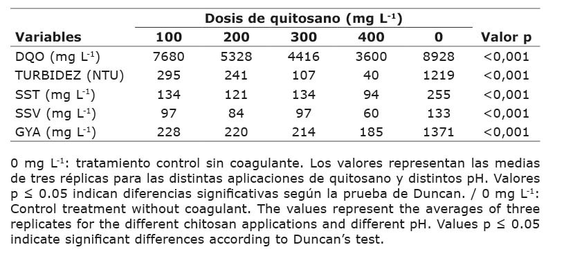 Dosis de 100 a 400 mg L-1 fueron estadísticamente significativas en la remoción de los parámetros de estudio, lo permitieron reducciones máximas de 92,5 %, 99,7 %, 99,3 %, 99,5 %, 91,1 % para las variables de DQO, turbidez, SST, SSV y GYA, respectivamente. Aunque la dosis de 400 mg L-1 fue la que presentó mejores resultados, la dosis de 200 mg L-1 de quitosano es una opción que mostró remociones significativas (p<0,05) y a pH ácido del agua y, de acuerdo con el análisis clúster, tuvo resultados similares a la dosis de 400 mg L-1.