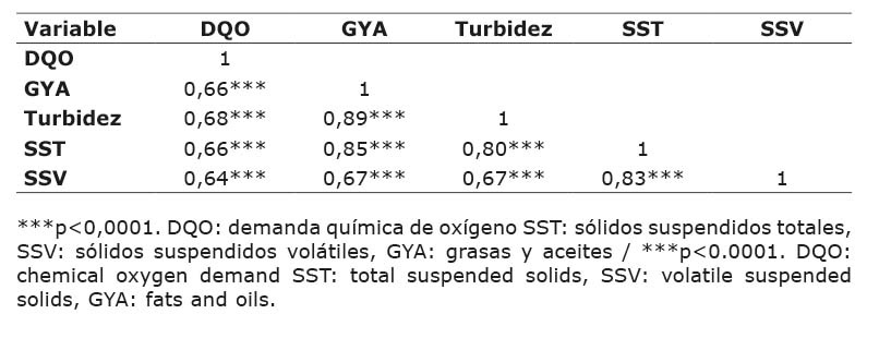 El mayor coeficiente de correlación se presentó entre los parámetros turbidez y GYA con un valor de 0,89, lo que indica una asociación directa debida a la presencia de GYA en forma de coloide y material en suspensión que aportan turbidez al agua, por ello, la correlación entre las GYA con los SST fue de 0,85. De igual manera, sucedió con la turbidez y SSV, ya que permitió observar como se redujeron estos parámetros en la medida en que se removieron los SST.