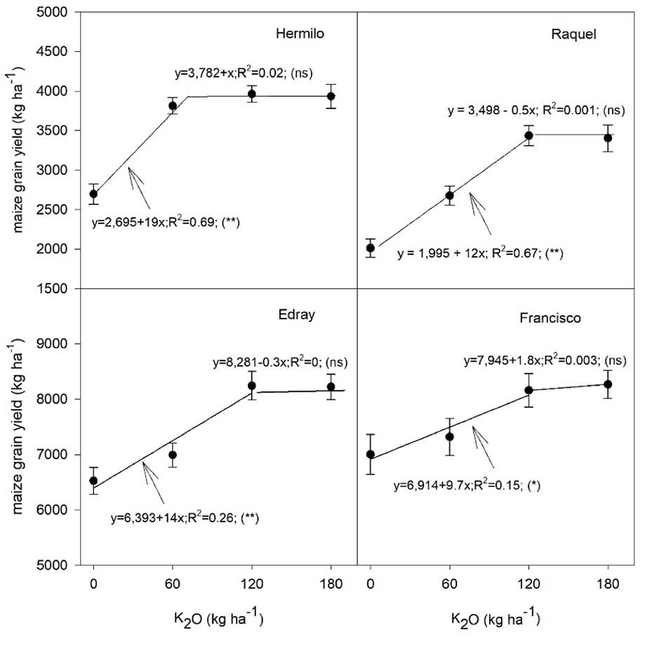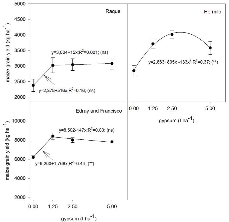 The positive response of maize yields to K applications (Figure 1) followed a linear-plateau model, showing increasing yields up to 120 kg ha-1 of K2O in three locations, and up to 70 kg ha-1 of K2O in location Hermilo. In locations Raquel, Edray and Francisco, crop response to gypsum followed a linear-plateau model with maximum yield at 1.25 t ha-1 of gypsum, while in location Hermilo the response was parabolic, with an increase in yield up to 3 t ha-1 of gypsum (Figure 2).