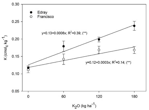 The effects of K application on maize yields can be related to the higher soil exchangeable K measured in the soil at the end of the 2017 crop cycle (Figure 3). The absence of crop response after 70 kg ha-1 of K2O in location Hermilo, and 120 kg ha-1 of K2O, in the remainder locations, is indicative of other yield limiting factors.