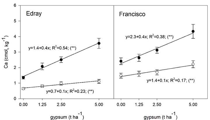 Gypsum does not neutralize or form acids so its reported effects on soil pH are typically small - in the order of 0.2-0.3 pH units – including both increases and decreases. Effects such as the increases shown in Figure 6 may result from the interaction of several mechanisms: the balance between H+ and Al+3 (which can hydrolyze and release H+) exchanged for Ca+2, and OH- exchanged for SO4-2, soil heterogeneity, and problems associated with sampling (Borkert et al., 1987; Sumner, 1993; Zoca & Penn, 2017). Any of those mechanisms could have acted in the present case, plus an additional one related to the presence of carbonates as impurities, unfortunately non quantified in the gypsum used, which are common in natural gypsum deposits (Zoca & Penn, 2017).