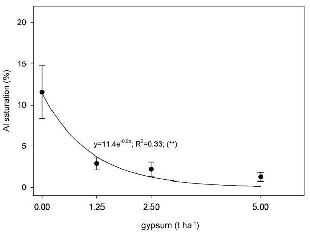 Gypsum can also boost crop yields through the reduction of exchangeable Al (Shainberg et al., 1989; Sumner, 1990; 1993). Although gypsum decreased Al saturation in the upper 7.5 cm of the soil in location Edray (Figure 5) the range of Al saturation values in which the response was observed (<12 %) was below the 25 % critical level for maize (Espinosa & Molina, 1999). These low values of Al saturation were the result of the lime application made to all the experimental area prior to the beginning of the study. Thus, it is unlikely that the effect of gypsum on Al was associated with the crop yield response.