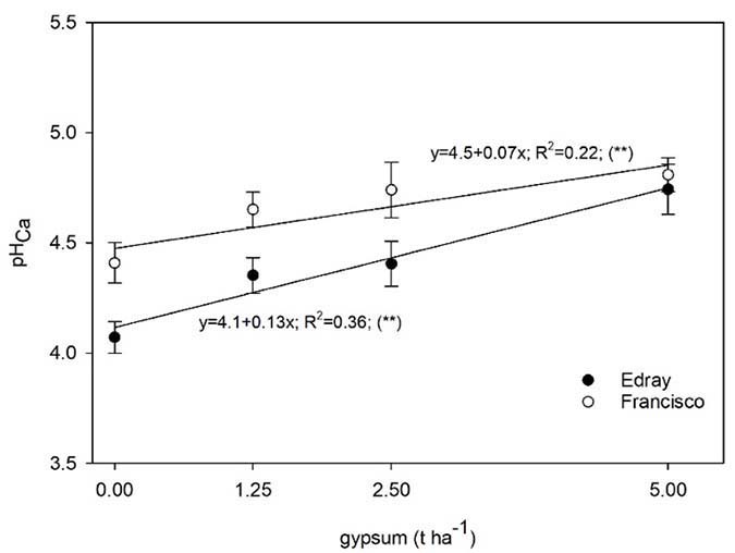 In both locations, gypsum increased pHCa at 0-7.5 cm (Figure 6); no effects were detected at 7.5-15 cm, where pHCa averaged 3.6 and 3.8 in Edray and Francisco locations, respectively.