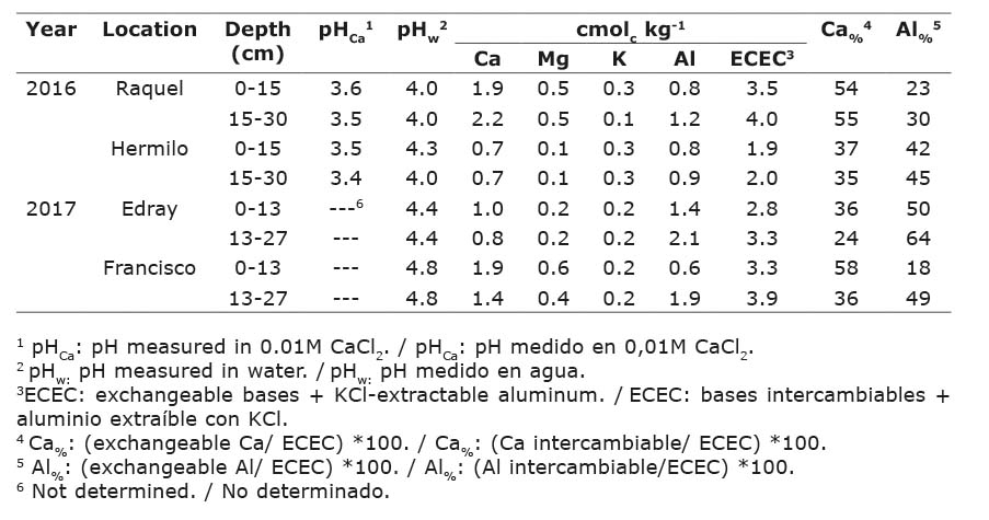 The pH was determined potentiometrically in water (pHw) and in 0.01M CaCl2 (pHCa) with a 1: 2 soil: water ratio; K, Ca, and Mg, were extracted with ammonium acetate 1N pH 7 (Knudsen et al., 1982), and extractable Al with KCl 1N (Lin & Coleman, 1960). Effective cation exchange capacity (ECEC) was calculated as the sum of exchangeable bases + KCl-extractable aluminum, while Al and Ca saturation (%) was calculated by dividing exchangeable Al and Ca by the ECEC.