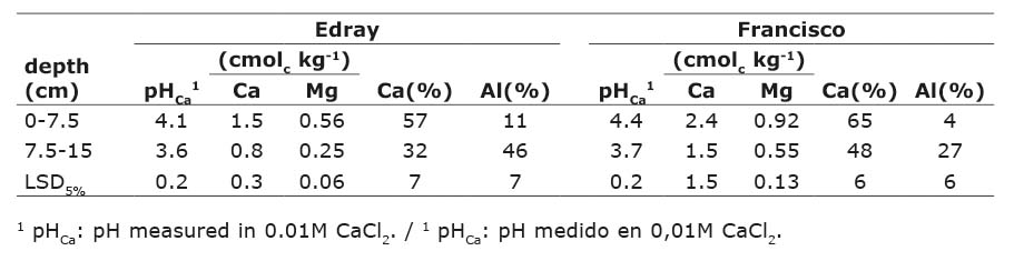 The comparison of the values of some soil properties measured at the 0-7.5 cm and at the 7.5-15 cm depth intervals, in soil that did not receive gypsum, allowed an estimation of the effects of the blanket application of dolomitic lime made before the beginning of the study. Liming improved the acidity conditions in the top 7.5 cm of soil by increasing pHCa, exchangeable Ca, and Mg contents, and by lowering Al content (Table 2).