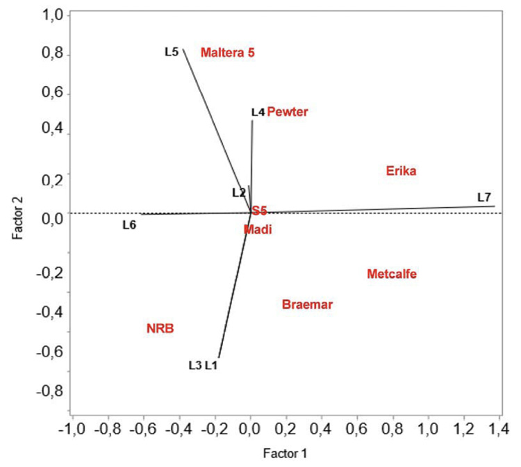Las variedades Madi y S5 con un rendimiento de grano asociado al vértice cero del gráfico biplot, presentaron estabilidad fenotípica amplia. Las otras ocho variedades, que incluyen los testigos comerciales, mostraron adaptación específica. NRB y Braemar asociado con L1 (Mosquera1) y L3 (Tibasosa), Bonus con L6 (Toca), Erika con L7 (Cota), Pewter con L4 (Duitama), Laisa con L4 (Duitama) y L5 (Mosquera2), los dos testigos comerciales Metcalfe con L1 (Mosquera1), L3 (Tibasosa), y L7 (Cota) y Maltera 5 con L5 (Cota) (Figura 1).
