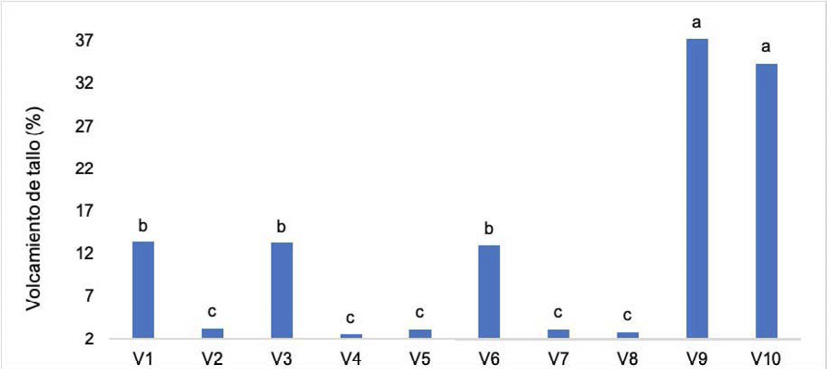 El volcamiento de tallo no presentó significancia estadística para la localidad y la interacción variedad por localidad. Solo se observó significancia estadística (p=0,01) para el factor variedad con un intervalo de valores de 2,0 % a 40,6 %. Los mayores resultados se obtuvieron con los dos testigos comerciales con una media de 34,4 % en Maltera 5, 37,3 % en Metacalfe, iguales estadísticamente entre sí (p=0,05) y diferente estadísticamente (p=0,05) con los cinco menores valores de 3,4 % en Bonus, 3,3 % en Braemar, 3,2 % en Madi, 2,9 % Pewter, 2,6 % en S5 y 3,8 % en Laisa (Figura 2). La menor variación en el volcamiento de tallo entre localidades con un intervalo de 11,7 % a 13,6 %.