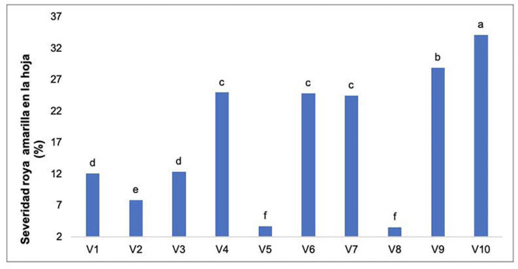 Figure 3. Severity of yellow rust on the leaf (Puccinia striiformis f. sp hordei) in eight varieties of barley (Hordeum vulgare L.) varieties in seven localities in the Cundiboyacense highlands. Corporacion Colombiana de Investigacion Agropecuaria (AGROSAVIA), Colombia. 2016-2017.