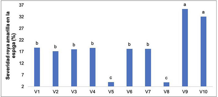 La severidad de la roya amarilla en la espiga solo presentó diferencias estadísticas (p=0,01) para el factor variedad, con un intervalo de 2,6 % a 40,0 %. Se observaron tres grupos de respuesta que tuvieron valores estadísticamente iguales entre grupos (p=0,05), el primero conformado por los dos testigos comerciales (Maltera 5= 34,5 % y Metcalfe= 28,9 %) fue el que mostró mayor severidad, el segundo grupo estuvo integrado con las dos variedades con los menores valores de severidad, Madi (3,7 %) y S5 (3,5 %), y el tercer grupo con valores de severidad intermedios, contuvo las variedades Laisa con 25,0 %, NRB con 24,9 %, Pewter y Bramer con 24,5 % y Erika y Bonus con 24,0 % (Figura 4).