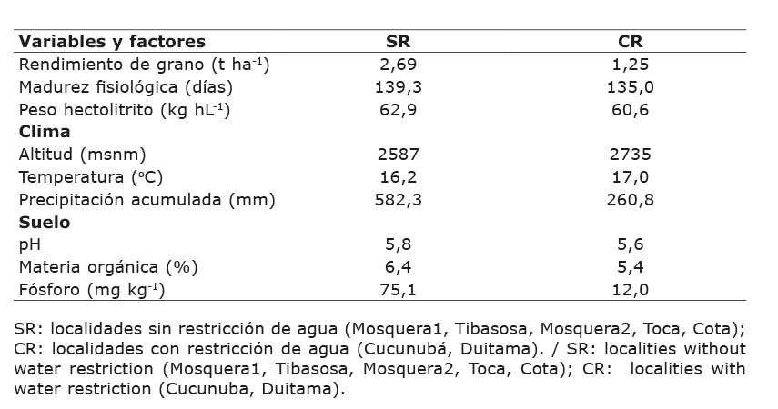 Las localidades solo presentaron diferencias estadísticas en rendimiento de grano, madurez fisiológica y peso hectolítrico según la precipitación ocurrida, por lo que se agruparon en: sin restricción (SR) (Mosquera1, Tibasosa, Mosquera2, Toca y Cota) y con restricción (CR) (Cucunubá, Duitama). El rendimiento de grano, la madurez fisiológica y el peso hectolítrico presentaron valores diferenciados asociados con estos dos grupos de localidades. El rendimiento de grano en SR fue de 2,69 t ha-1 y CR de 1,25 t ha-1, la madurez fisiológica de 139,3 días en SR y de 135,0 días en CR y el peso hectolítrico de 62,9 kg hL-1 en SR y de 60,6 kg hL-1 en CR.