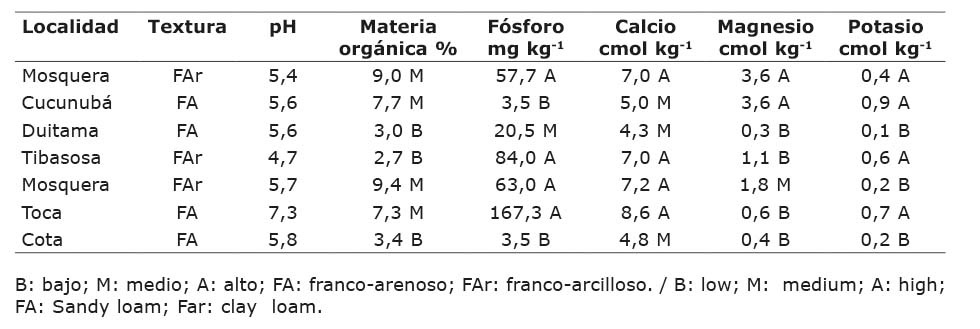 Los suelos asociados a las localidades de evaluación por ubicación y geomorfología en el altiplano Cundiboyacense, se clasificaron como ácidos, del orden Inceptisoles, con predominio de textura franco arcillosa y franco arenosa, pH desde 4,7 a 7,3, materia orgánica de 2,7 a 9,0 % y un contenido de bajo a alto de fósforo de 3,5 a 167,3 mg kg-1. Los contenidos de calcio, magnesio y potasio en cmol kg-1, fueron: de 4,3 a 8,6 de calcio; de 0,3 a 3,6 de magnesio y de 0,2 a 0,9 de potasio (Cuadro 1).