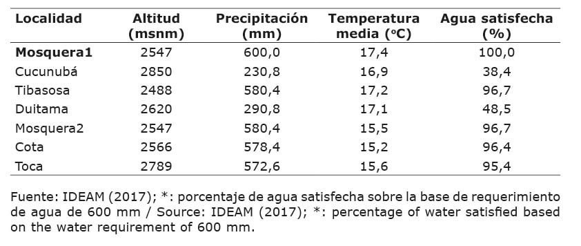 Table 2. Altitude, precipitation, mean temperature, and satisfied water occurred between the emergence of barley (Hordeum vulgare L.) harvest, in seven locations in the Cundiboyacense highlands. Corporacion Colombiana de Investigacion Agropecuaria (AGROSAVIA). Colombia. 2016-2017.
