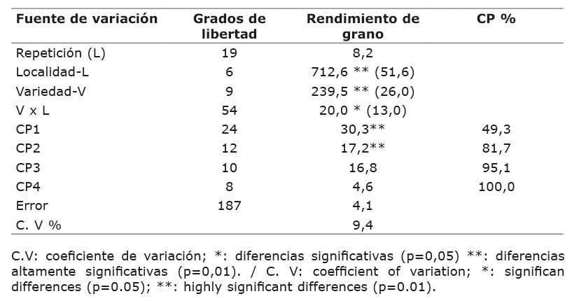 El análisis de varianza combinado a través de localidades el rendimiento de grano presentó diferencias altamente significativas (p=0,01) para localidad y variedad y significativa (p=0,05) para la interacción variedad x localidad. La mayor participación de la variación total del modelo estadístico para rendimiento de grano se debió a los factores localidad y variedad, con un valor de 71,2 % y 13,7 %, respectivamente, mientras que la menor participación correspondió a la interacción variedad x localidad (8,1 %). Con base en el análisis AMMI, se estableció que los dos primeros componentes principales CP1 Y CP2, con una significancia de α= 0,01, explicaron el 81,7 % de la interacción genotipo x localidad (Cuadro 3).