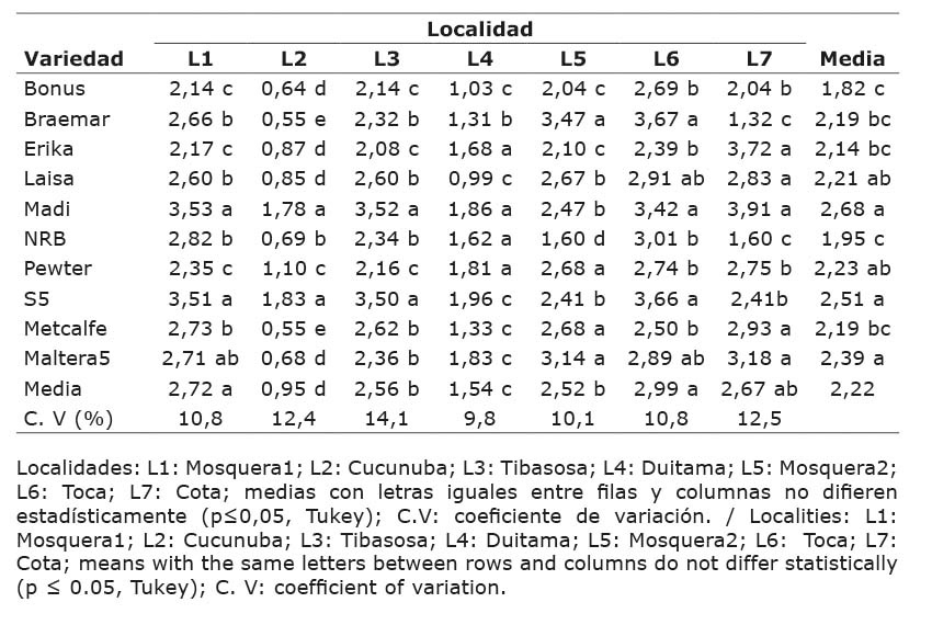 Table 4. Grain yield (t ha-1) of eight barley (Hordeum vulgare L.) varieties in seven locations in the Cundiboyacense highlands. Corporación Colombiana de Investigación Agropecuaria (AGROSAVIA). Colombia. 2016-2017.
