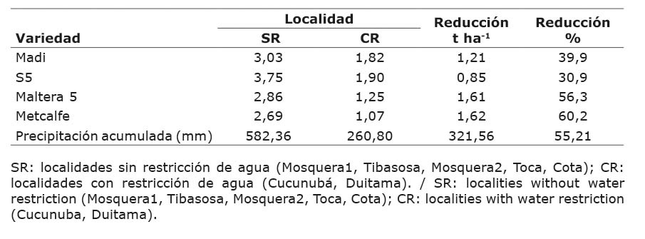La precipitación acumulada durante el periodo comprendido entre la siembra y la cosecha de grano permitió agrupar las localidades en dos: a) localidades sin restricción de agua (SR) (Mosquera1, Tibasosa, Mosquera2, Toca, Cota) y b) localidades con restricción de agua (CR) (Cucunubá y Duitama) (Cuadro 2 y 5). En las localidades SR el rendimiento de grano (t ha-1) y su reducción en porcentaje (paréntesis) fue de 1,21 (39,9 %) en Madi y de 0,85 en S5 (30,9 %), diferente a la observada en las localidades CR con 1,61 (56,3 %) para Maltera 5 y 1,62 (60,2) para Metcalfe (Cuadro 5).