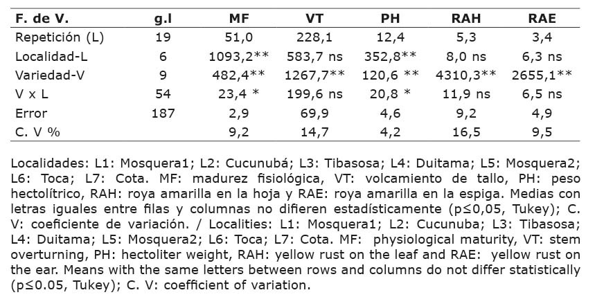 El análisis de varianza que combinó localidades para madurez fisiológica y peso hectolítrico, presentó diferencias altamente significativas (p=0,01) para los factores localidad y variedad y significativa (p=0,05) para la interacción variedad por localidad. En las variables volcamiento de tallo, roya amarilla en la hoja y en la espiga, se observaron diferencias altamente significativas (p=0,01) para los tres factores. En todos los casos, los coeficientes de variación fueron menores al 15,0 %, lo cual permite inferir la confiabilidad de los datos (Cuadro 6).