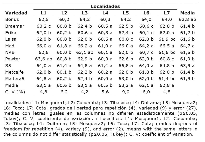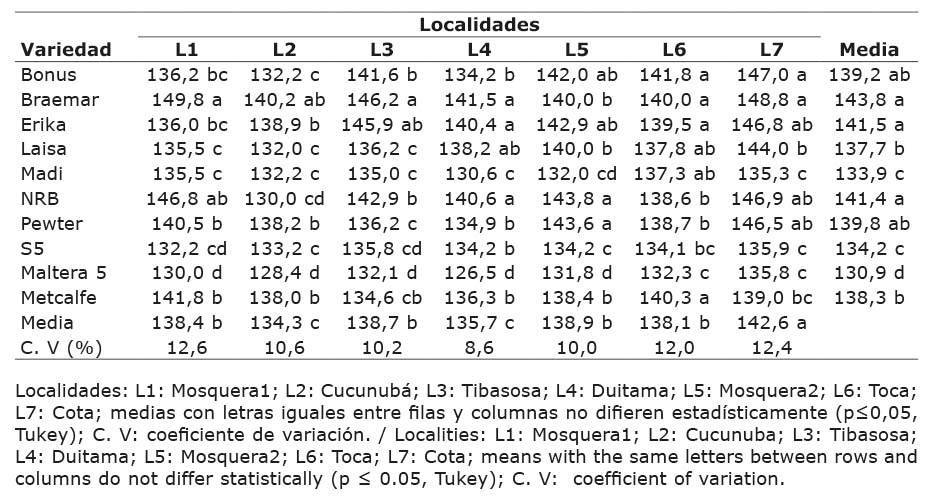 La madurez fisiológica en días presentó un intervalo de valores de 130,0 para NRB en Cucunubá (L2) y 148,8 para Braemar en Cota (L7) con una media para las variedades de 143,8 en Braemar, 141,5 en Erika, 141,4 en NRB, 141,4 en Pewter, 139,2 en Bonus y 139,8 en S5, iguales estadísticamente entre sí (p=0,05) y diferentes a la media de 138,3 en Metcalfe y de 137,7 en Laisa. Las variedades que presentaron la menor media fueron Madi con 133,9 y Maltera 5 con 130,9 diferentes estadísticamente entre sí (p=0,05), mientras que Madi y S5 difirieron estadísticamente con Maltera 5. La mayor variación se observó entre localidades con un intervalo de 134,6 a 141,8; con una media por localidad de 142,6 en Cota (L7), diferente estadísticamente (p=0,05) a Mosquera (L5) con 138,9, Tibasosa (L3) con 138,7, Mosquera1 (L1) con 138,4 y Toca (L6) con 138,1. Las dos menores medias iguales estadísticamente entre sí (p=0,05) se obtuvieron en L4 (Duitama) con 135,7 y L2 (Cucunubá) con 134,3 (Cuadro 7).