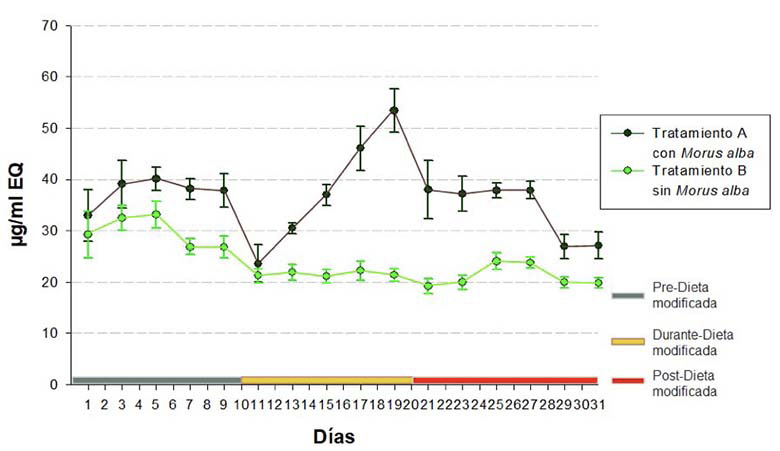 En el contenido de flavonoides totales en la leche de cabra se pudo observar un ajuste a la baja durante el periodo de pre-dieta (días 1-10) en ambos grupos de cabras (Figura 1). Este contenido inicial es atribuible a la persistencia de los flavonoides proporcionados en la dieta anterior al experimento; sin embargo, al día 10 ambos grupos presentaron la misma concentración de flavonoides en la leche, es por ello por lo que se realizó este periodo de pre-dieta, con la finalidad de controlar esta variable. Luego, durante el periodo de dieta con morera (días 11-20) se observó un incremento de la concentración de flavonoides en la leche del grupo A en tratamiento, con una diferencia estadística altamente significativa (p = 0,001) con respecto al grupo B de control. El grupo A alcanzó una máxima concentración de flavonoides de 53,45 μg ml-1 EQ, con un promedio de 38,11 μg ml-1 EQ, mientras que para el tratamiento B conservó 21,55 μg ml-1 EQ en promedio. Al pasar al periodo post-dieta (días 21-31), donde se regresó a la dieta base sin morera, se observó que la persistencia de los flavonoides en el grupo A se conservó un 20 % más al final del experimento que el grupo B de control.