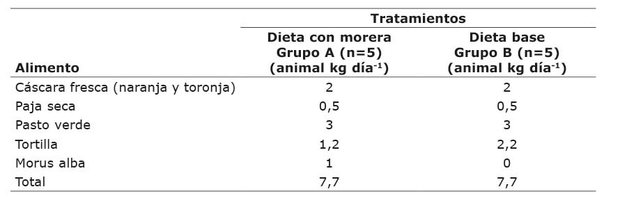 El estudio se basó en el modelo propuesto por Paraskevakis (2015) con algunas modificaciones. Se formaron dos grupos de cabras de la raza alpina con cinco hembras cada uno, los criterios de inclusión fueron: que estuvieran sanas, libres de mastitis, con ordeño manual, mismo número de partos (3), edad de tres años, alimentación estabulada desde el nacimiento y con ordeña de fondo con intervalo doble (matutino y vespertino). Cada animal se identificó con el número de registro otorgado por la Secretaría de Agricultura y Desarrollo Rural (SADER antes SAGARPA), luego se separaron en el grupo A que recibió el tratamiento que consistió en una dieta formulada y enriquecida con morera, y el grupo B que sirvió de testigo con una dieta sin morera.