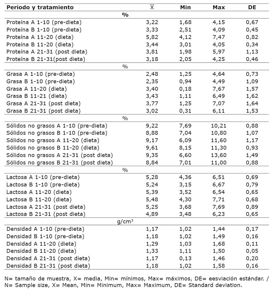 Los sólidos no grasos (SNG) para el tratamiento A tuvieron un valor máximo de 11,26 % y un mínimo de 7,34 %, para B el máximo observado fue de 11,02 % y el mínimo de 8,06 %, no se encontraron diferencias significativas (p=0,89), las medias para ambos tratamientos oscilaron entre 8,88 % y 9,61 %. La densidad (D) se mantuvo constante en ambos tratamientos, el valor más alto para el grupo A fue de 1,38 g cm-3 y para B de 1,41 g cm-3, no se encontraron diferencias significativas en ambos grupos (p=0,98). El intervalo de medias estuvo entre 1,17 y 1,38 g cm-3 para A y 1,29 y 1,38 g cm-3 para B.