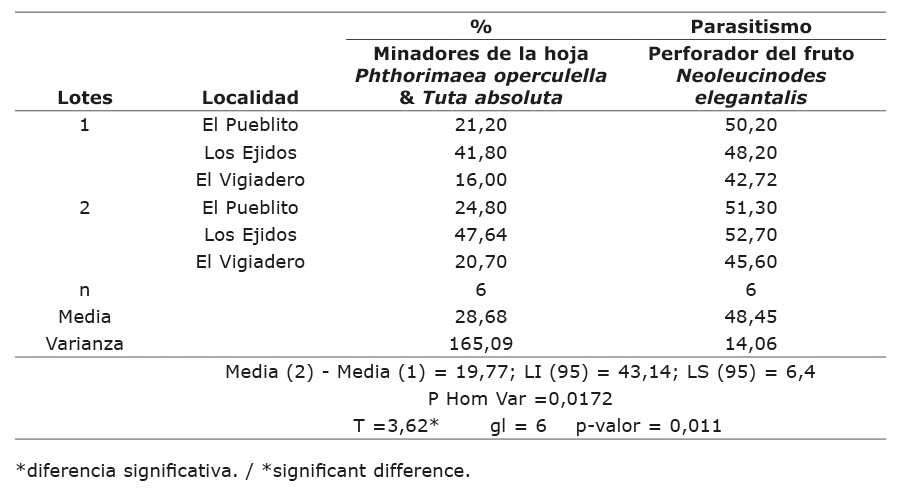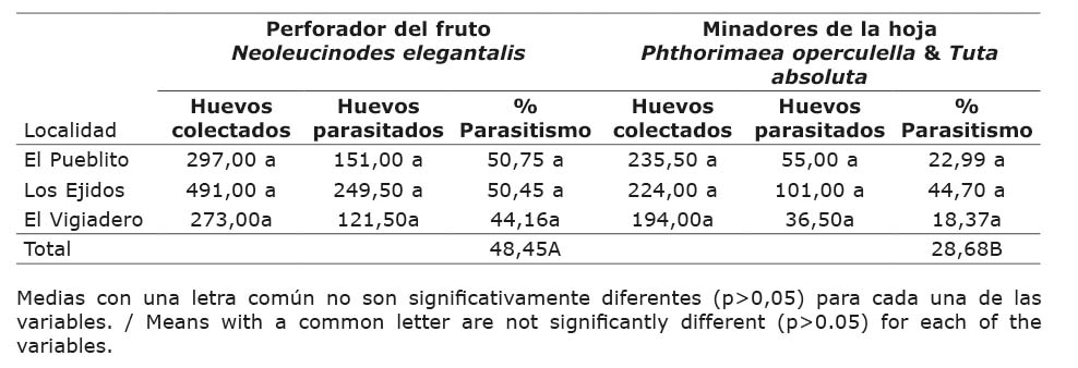 Las localidades mostraron un comportamiento similar del parasitismo ejercido por T. pretiosum sobre los huevos del perforador del fruto Neoleucinodes elegantalis, así como sobre los minadores de la hoja. Sin embargo, el análisis mostró diferencias significativas entre el porcentaje de parasitismo ejercido por T. pretiosum sobre el perforador del fruto y los minadores de la hoja con valores de 48,45 % y 28,68 %, respectivamente (Cuadro 1).