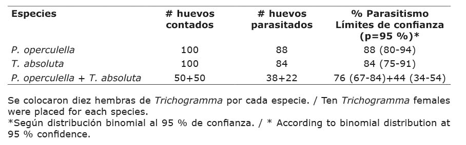 En el laboratorio, al observar los huevos de cada especie minadora de la hoja P. operculella y T. absoluta, se encontró que los huevos de ambas especies presentaron un parasitismo muy similar, cuando los huevos de cada especie estuvieron separados, con valores de 88 y 84 %, respectivamente. Sin embargo, se observó un parasitismo 32 % mayor en favor de P. operculella sobre T. absoluta, cuando estuvieron juntos (Cuadro 3). Estos porcentajes estuvieron dentro los rangos aceptados de la distribución binomial a un nivel de p=95 %.