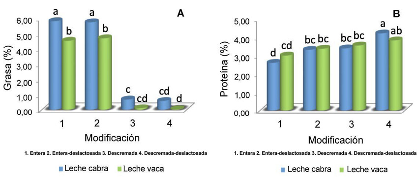 En general, se observó un aumento de la proteína cuando se aplicó algún tipo de modificación (deslactosado y/o descremado), dicho efecto fue significativamente más pronunciado en la leche de cabra (p≤0,05) (Figura 1).