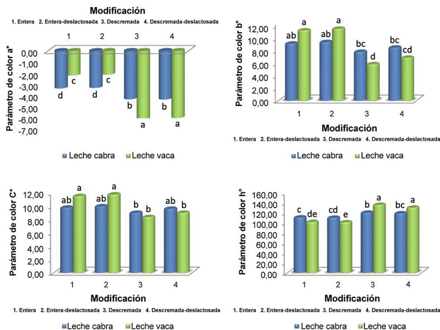 No se encontraron diferencias significativas (p>0,05) en el color entre las leches de vaca deslactosada y descremada-deslactosada, tampoco entre las leches de cabra descremada y descremada-deslactosada con respecto a la leche entera de vaca, con el color más amarillo. Las leches de cabra entera y la deslactosada fueron las menos amarillas (Cuadro 5).